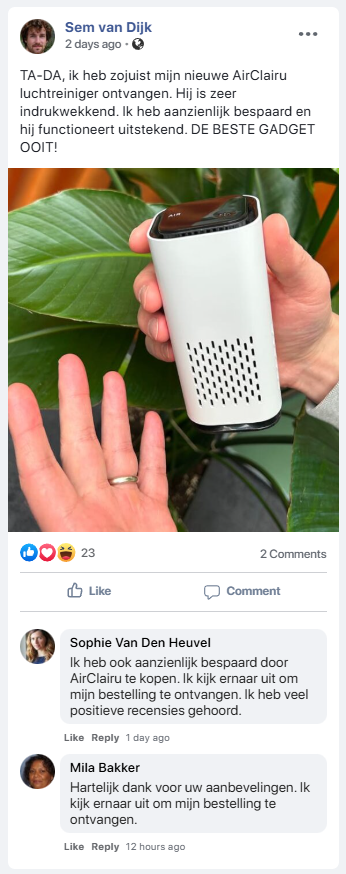 Met meer dan 2 miljoen tevreden gebruikers en duizenden geverifieerde 5-sterrenreviews is AirClairu snel uitgegroeid tot de meest vertrouwde draagbare luchtreiniger van het land.